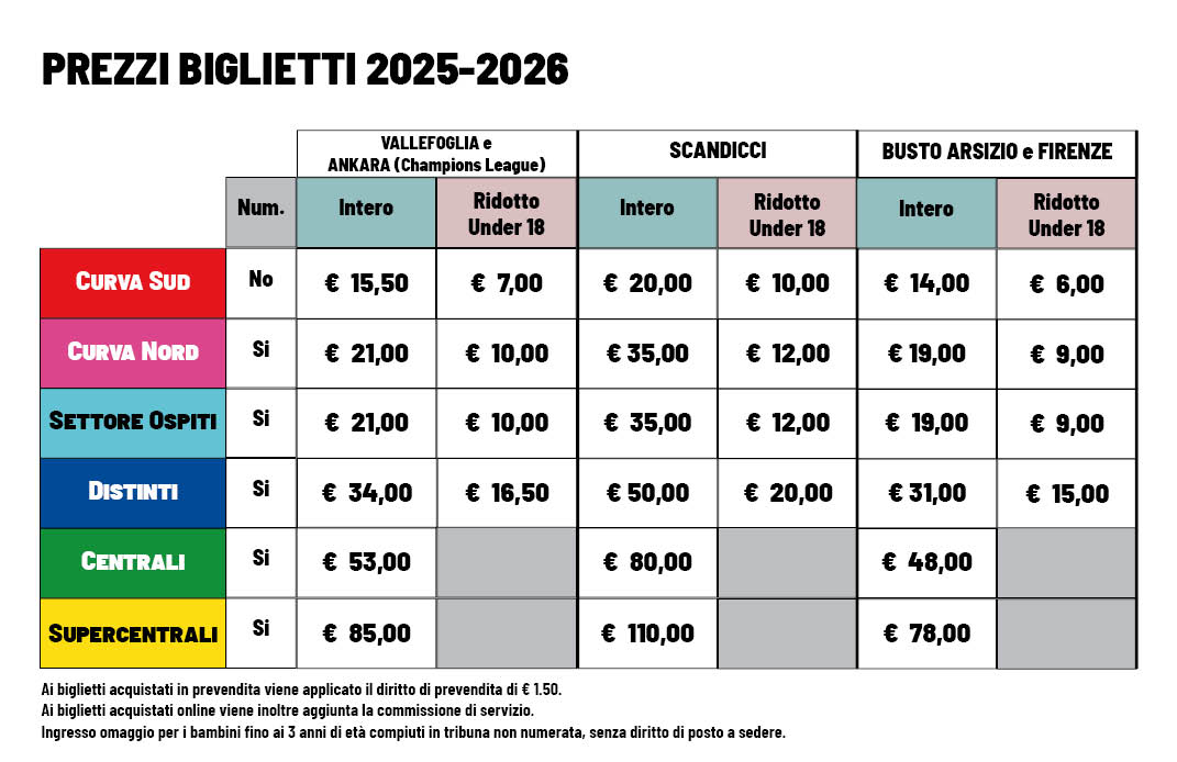 - Tutti i biglietti sono nominativi. In caso di necessità di cambio nominativo, compilare il modulo per la cessione del biglietto, da consegnare agli steward al momento del controllo accessi;