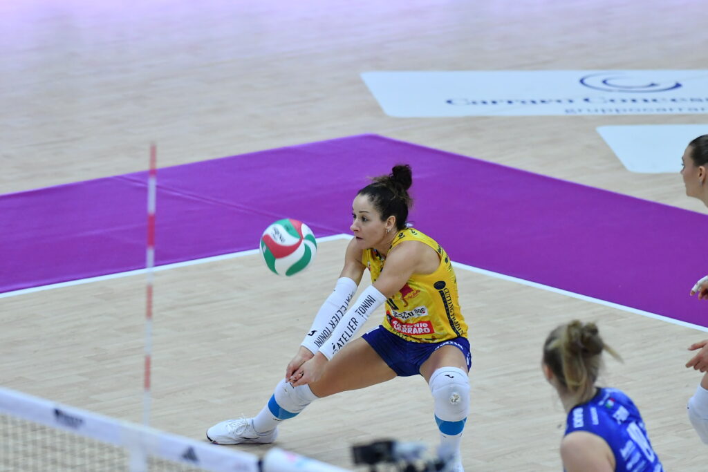 Quando Lubian infila la prima fast del suo match, quella dell’8-4, Ewert ha già mandato a segno tutte le attaccanti, Adigwe dà una spallata con l’ace del 14-9 che costringe la panchina avversaria al primo time-out. De Gennaro trasforma in oro una palla vagante e Gabi la mette giù (18-13), poi la verdeoro capitalizza il “megarally” del parziale (20-14, 13 punti per la brasiliana nella serata). Le Pantere giocano in scioltezza e portano a casa l’1-0 con l’attacco di Ewert (25-16).  Sono solo 2 gli errori dell’attacco gialloblù nel primo set, con una percentuale a punto del 45% e 3 giocatrici a quota 4.