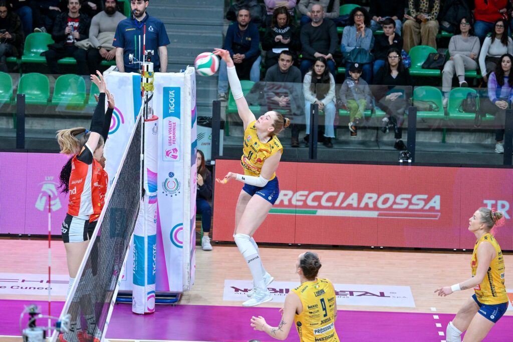C’è un terzo set accesissimo da giocare per le Pantere: Chirichella trova la via del muro per accorciare sulle sfuriate di Cuneo (11-9), poi Daalderop sale in cattedra e porta avanti le gialloblù con 2 aces (12-13). Haak si prende il primo break point del parziale (13-15, 17 centri per la svedese, top scorer del match), Chirichella sfrutta la ricezione sbagliata per affondare il 16-19. Daalderop ha ancora linfa da posto 4 (19-21), Sillah usa le mani del muro avversario del 21-23: matchpoint siglato da Haak, quindicesima vittoria in campionato per Conegliano.