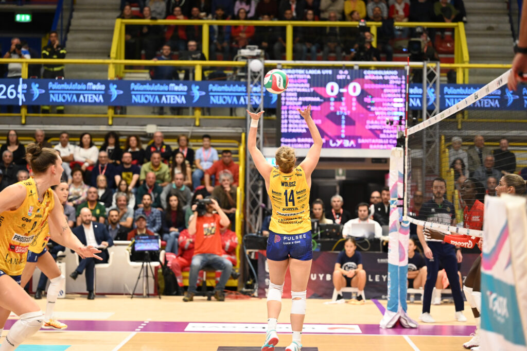 Nel secondo set Wolosz e compagne iniziano con un altro spirito, vedi l’ace di Chirichella che porta all’1-4 iniziale. Haak e Zhu segnano un paio di allunghi (9-12), ma le avversarie tornano prepotentemente a condurre: Fahr dà consistenza al muro gialloblù che porta al 22-22 con la complicità di Haak (9 punti della svedese nel parziale con 2 muri, la centrale top gialloblù a muro con 4 alla fine), poi è Busto ad avere l’allungo decisivo in coda al set. Ma la centrale campione del mondo ha saputo dare ordine al muro quando le Pantere ne aveva bisogno.
