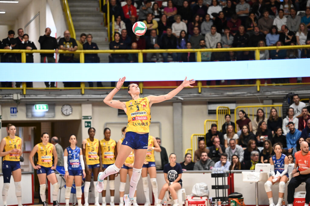 È ancora un’ottima Prosecco DOC quella che inizia il quarto set (0-4), è uno scambio da favola tra le due squadre quello che vale il 4-8 di Haak. Spallatona gialloblù con tre fast di Lubian (6-14, 7 punti per Marina alla fine), Daalderop entra a dare linfa alla prima linea e il set piano piano scivola via (13-20): c’è spazio per il debutto in A1 di Sillah, mentre Haak è sempre dominante in attacco, lo stesso dicasi per Fahr che piazza il 15-23 (5 mattoni e 2 muri nel quarto). Daalderop segna l’allungo del set point, il 2-2 arriva con il muro gialloblù, l’olandese chiuderà con 3 punti.