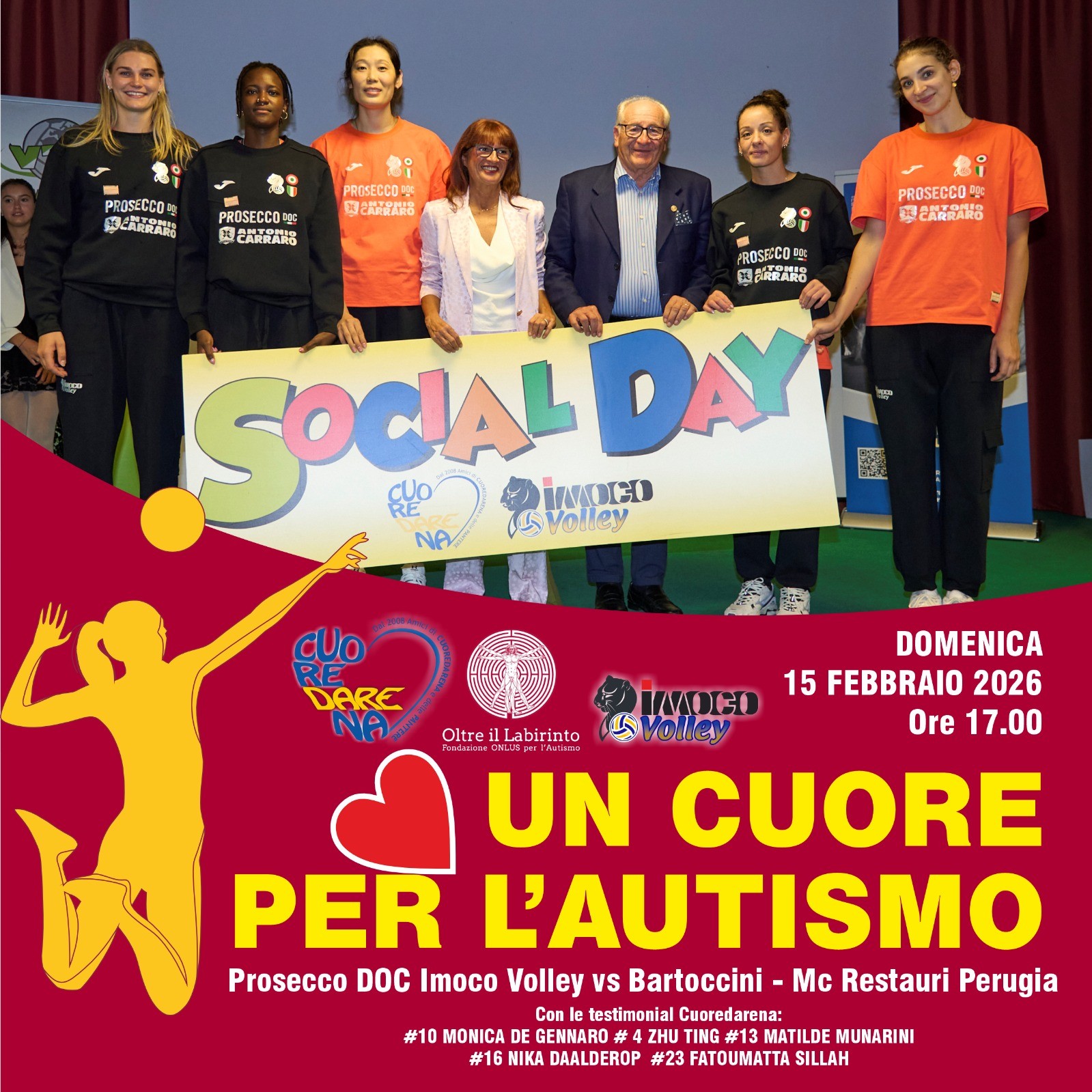 Domenica nel match con Perugia il cuore solidale gialloblu batterà per Fondazione Oltre il labirinto nella 16esima edizione del Social Day a favore dell’associazione, promosso da VTV Volley – Comitato Cuoredarena in collaborazione con Prosecco DOC Imoco Volley.  In occasione della partita di campionato, i tifosi gialloblu potranno regalarsi o regalare un bellissimo cuore fatto a mano e autografato dalla Pantere. Tutto il ricavato sarà devoluto alla Fondazione per sostenere i progetti dedicati ai ragazzi e alle persone con autismo. I cuori si potranno acquistare al banchetto allestito nel corridoio vicino al bar interno al palazzetto.
