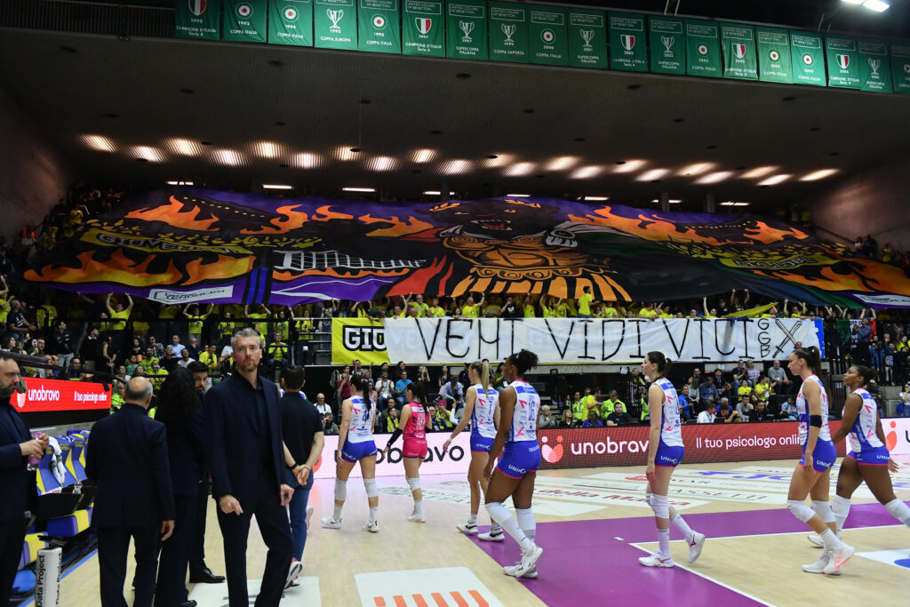 Pantere ordinate in avvio, primo break firmato Zhu con un pallonetto fatato, il turno a servizio di Haak garantisce il primo strappo gialloblù con i muri della superstar cinese e di Wolosz (8-3). Lanier si sblocca sulla pipe suggerita da Bosio, doppio lampo di Gabi per ristabilire le distanze (12-6). Arriva il momento di Chirichella, produce una gran difesa su Egonu e piazza l’ace del 14-6 subito dopo; De Gennaro alza al bacio per Haak e Fahr si sblocca a muro (17-9), Daalderop esordisce nella gara in seconda linea. Coach Santarelli ferma l’inerzia di Milano chiamando time-out (21-17), Gabi consegna cinque set point (6 punti con il 55% in attacco per la brasiliana, chiuderà con 20 centri e 2 muri) e le Pantere passano (25-19).