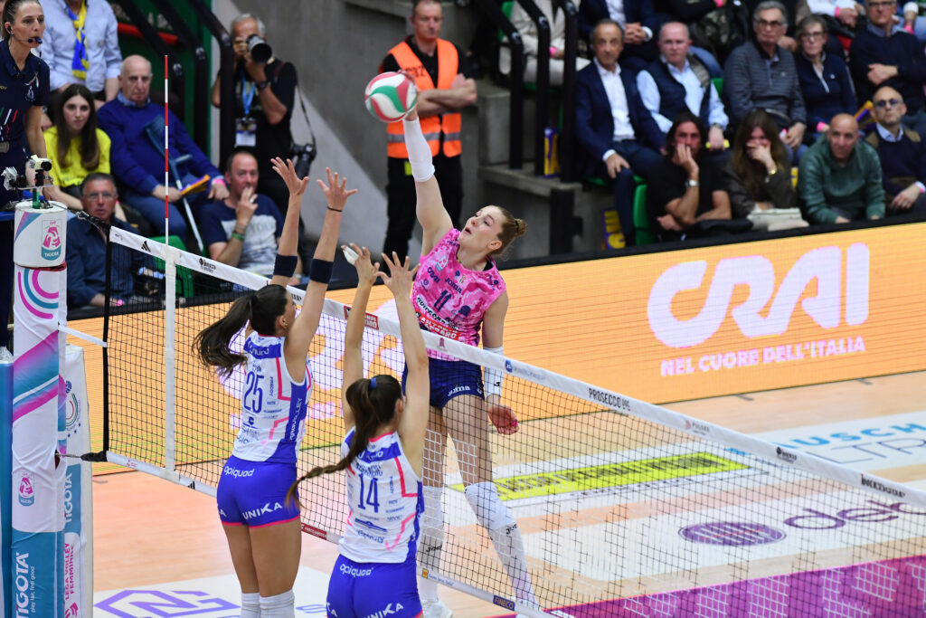 Primo vantaggio Milano su errori della Prosecco DOC nel secondo set (2-4), Haak segna con un’acrobazia, poi Kurtagic si ripete a muro (5-9). Coach Santarelli fissa due time-out per non lasciar scappare il Vero Volley (6-11), Gabi spunta nelle difficoltà tra attacco e muro (8-12), Zhu e Haak riprendono le misure (13-15, 4-0 di parziale). Egonu torna a impattare e Milano strappa ancora, Ewert e Adigwe danno nuove soluzioni alla diagonale (15-19), Daalderop fa rifiatare Zhu. Palaverde in piedi per una difesa da distesa di De Gennaro, la Prosecco DOC torna a contatto (20-21). Zhu disinnesca due set point Numia (25-25, 4 punti nel momento del bisogno per la schiacciatrice), nel rush finale del periodo pareggia Milano sul 25-27.