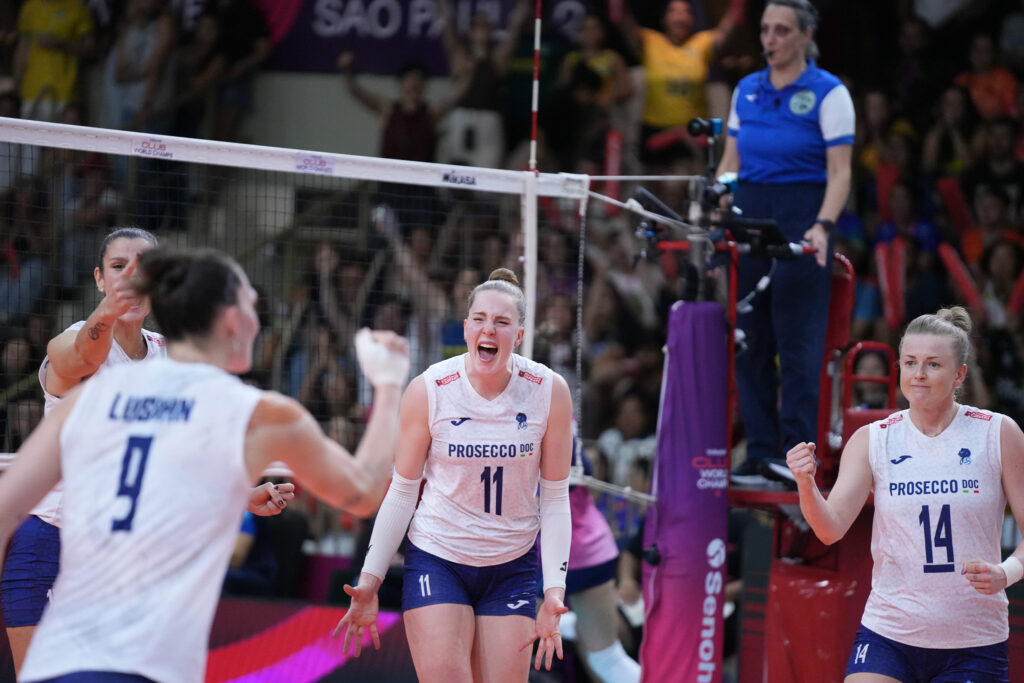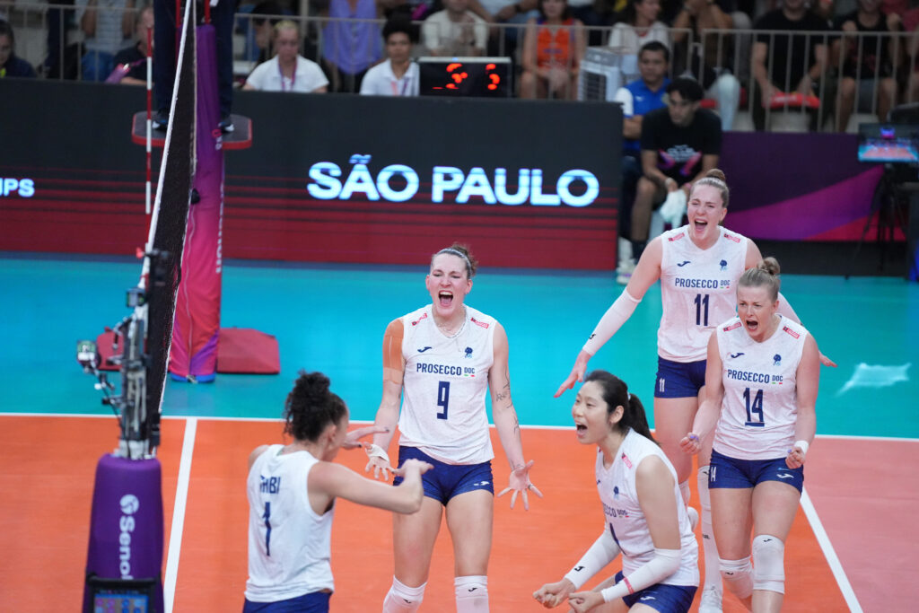 La battaglia è vivissima anche nel quarto set, in cui non c’è appello per la squadra di coach Santarelli. Partre meglio Scandicci, ma Conegliano non molla. Isabelle Haak (8 punti e il 57% nel set) non vuole abdicare, mura e dà la parità a quota 10. Una ispirata Kate Antropova (3 aces, 3 muri e 26 punti nel match) e le sue agguerrite compagne spingono forte con la battuta e le Pantere vacillano sotto di 5 lunghezze. Coach Santarelli prova il doppio cambio con Ewert e Adigwe che cerca di rivitalizzare l’attacco gialloblù e tornare a -4 . Poi una fiammata di Zhu (13 punti alla fine) serve ad accorciare le distanze (-3, 18-15). Sale l’adrenalina del match e a San Paolo si alzano i gradi al palasport, gremito di passione brasiliana. La Prosecco DOC Imoco sale di tono, nel crescendo gialloblù ci sono l’ace di Chirichella (-2) e il primo muro di Marina Lubian (11 punti, 3 aces, 70% in attacco!), poi ancora Zhu rimette le cose definitivamente in equilibrio (21-21). Sembra che l’inerzia sia ora dalla parte delle venete, ma nel momento clou la partita si rivela ostica come lo è stata dall’inizio: Nwakalor è decisiva a muro (5 “blocks” pesanti per lei nel match, con 13 punti), 23-23. Ultimi punti con qualche sbavatura delle campionesse in carica, ma una grande prova di carattere delle toscane di coach Gaspari. La Savino del Bene ritrova d’incanto il ritmo giusto e Conegliano deve arrendersi, le toscane approfittano con maestria di ogni spiraglio concesso per andare a prendersi set e partita, 25-23.