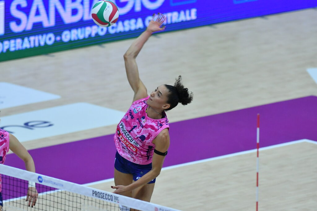 Il primo set si gioca alla pari tra le due squadre, che tra “megarally” e difese a tutto campo tengono l’equilibrio: dopo il primo break subito (13-15), le Pantere si compattano e trovano il servizio pulito di Fahr, nel 5-0 che dà lo strappo verso il 19-16 c’è lo zampino di Haak da posto 2 e dal muro. Le centrali svettano nella domenica del Palaverde, con 21 punti e 4 muri in combinata. Adigwe e Ewert danno il cambio alla diagonale, Scognamillo c’è in seconda linea nei momenti roventi, è Gabi a segnare la maggior parte dei punti importanti in coda, compreso il set point del 25-22. Carioca da 6 punti nel parziale, 0 errori in attacco e il 60% di efficienza.