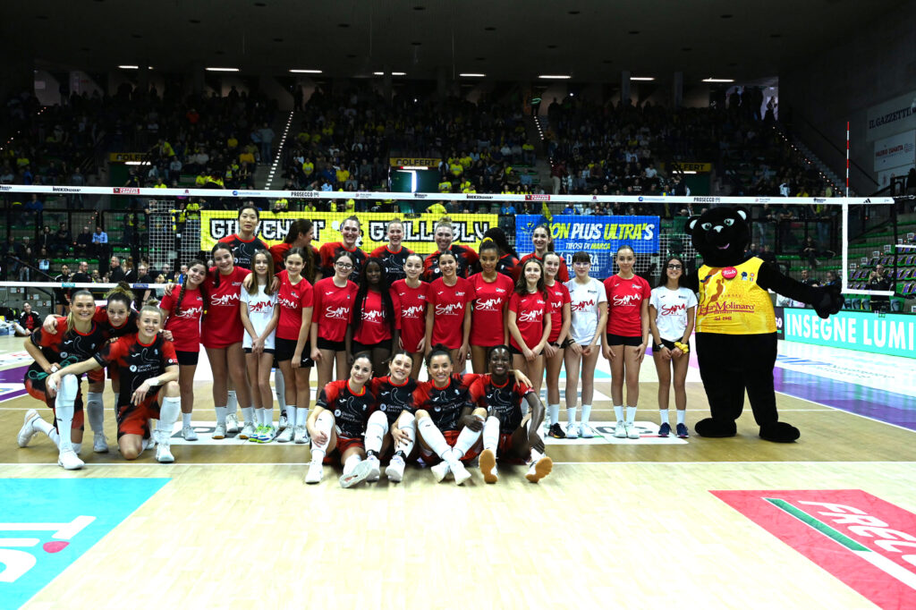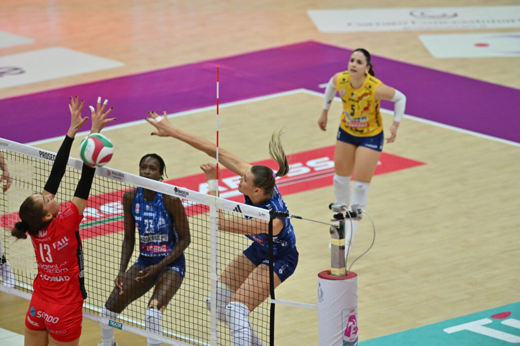 Prosecco DOC A. Carraro Imoco Conegliano: Gabi ne, Zhu 2, Scognamillo, Ewert 4, Lubian 2, De Gennaro ne, Haak 11, Munarini 7, Wolosz, Adigwe 12, Daalderop 14, Chirichella ne, Fahr 4, Sillah 22. All. Santarelli