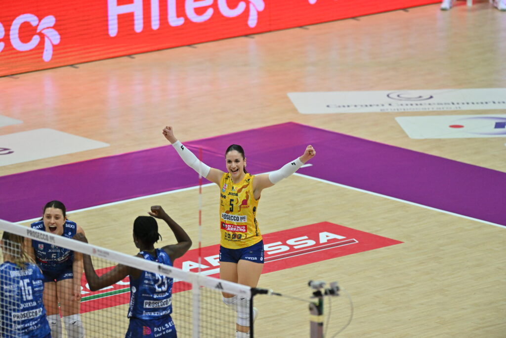 Muro di Gennari in apertura di quarto set (2-3), Sillah continua sugli standard in attacco (7-7, 22 punti e titolo di MVP per la slovena). Gardini ha fortuna con la pipe e con il servizio (7-12), coach Santarelli opera il doppio cambio per ristabilire l’andamento, Micoli risponde con Kump e Turla, con tanto di ace per la regista (12-17). Parziale immediato per la Prosecco DOC (17-17), Gardini segna un altro punto pesante, Mazzaro trova l’ace (21-24): Zhu entra e annulla due set point, Haak regala un match point a Conegliano, sul 26-24 di Lubian esplode il Palaverde.