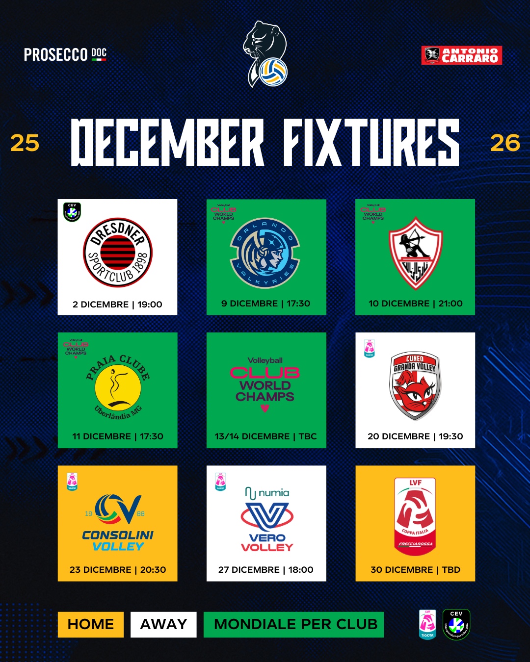 24 novembre 19.30 Palaverde A.Carraro Imoco-ZOK Ub, 9 dicembre ore 18 Fatum Nyireghyaza-A.Carraro Imoco, 23 dicembre ore 18 Chemik Police-A.Carraro Imoco;