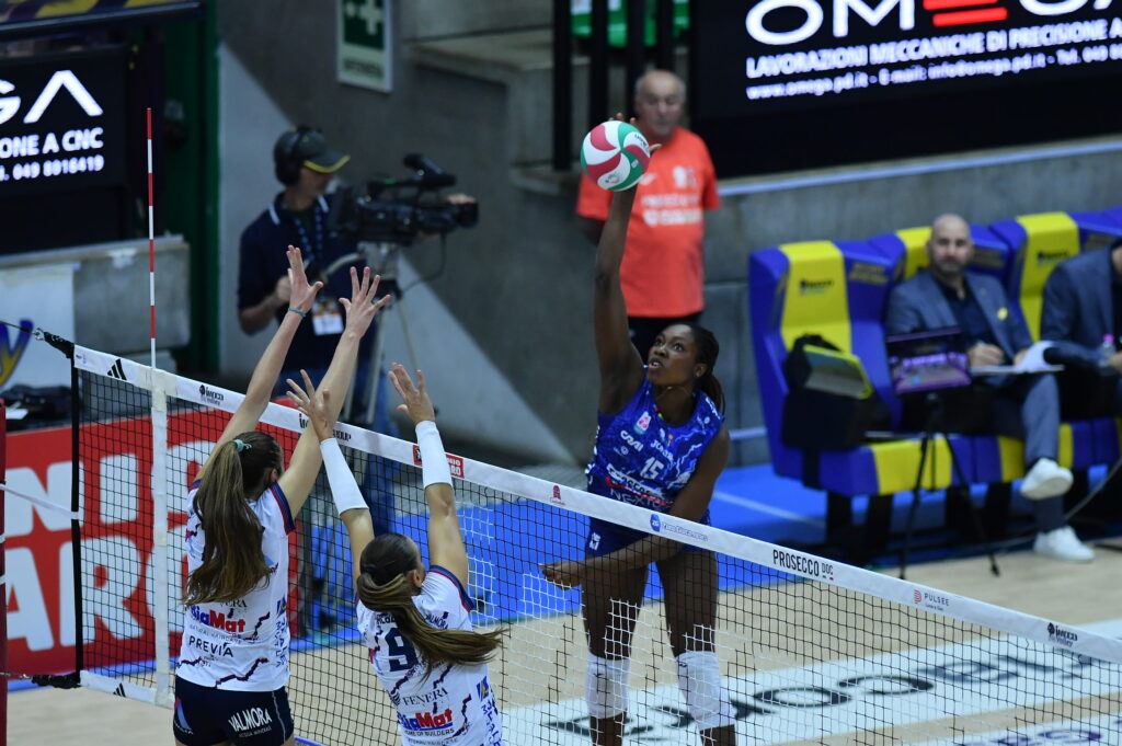 La prima sgasata del terzo set la conduce Sarah Fahr, che infila l’ace del 3-0 iniziale; sarà sempre la campionessa olimpica a dare una altro break alla Prosecco DOC, quello dell’11-8 (finisce alle porte della doppia cifra, 9 punti, con il 70%), poi Chieri riprende il filo del discorso e prova ad avvicinarsi. Haak rispedisce indietro le piemontesi con il punto del 20-19, Sillah rientra dopo aver lasciato il posto ad un’ottima Scognamillo in seconda linea: slovena micidiale da posto 4 e con il muro (24-20), Adigwe capitalizza la prima palla del 2-1 a disposizione. Per Fatoumatta saranno 6 i punti alla fine del set, compreso 1 muro, con il 62% di efficienza.