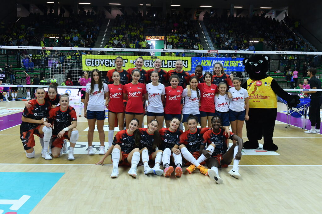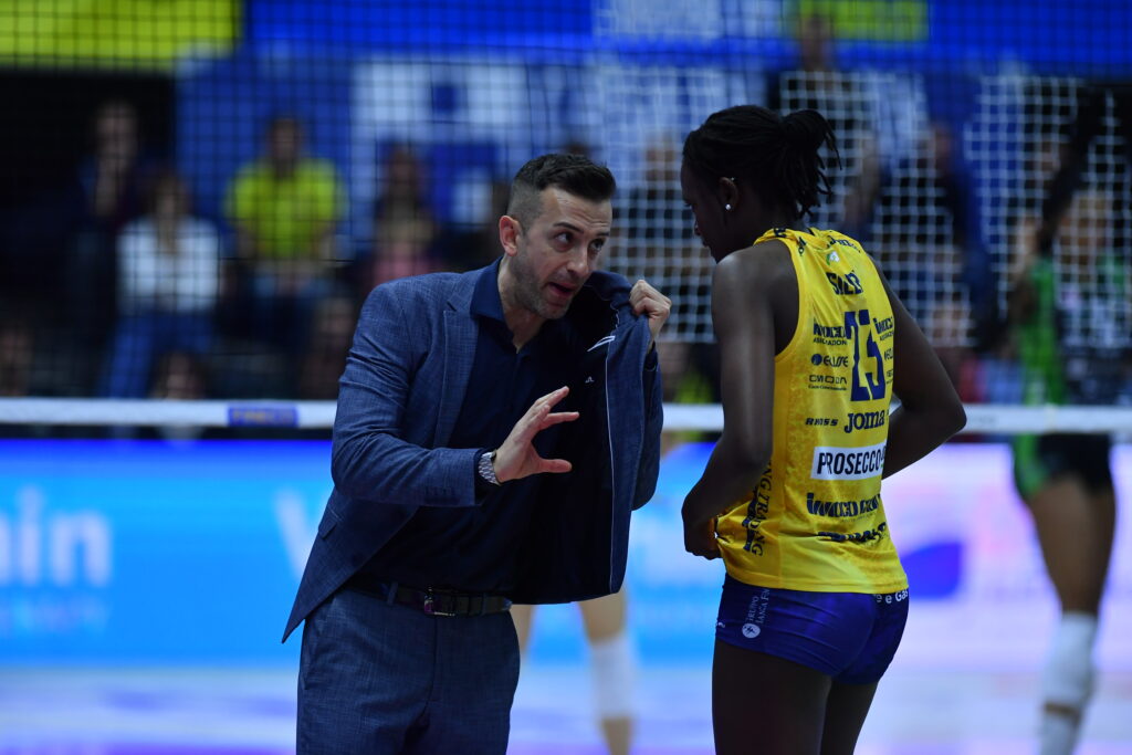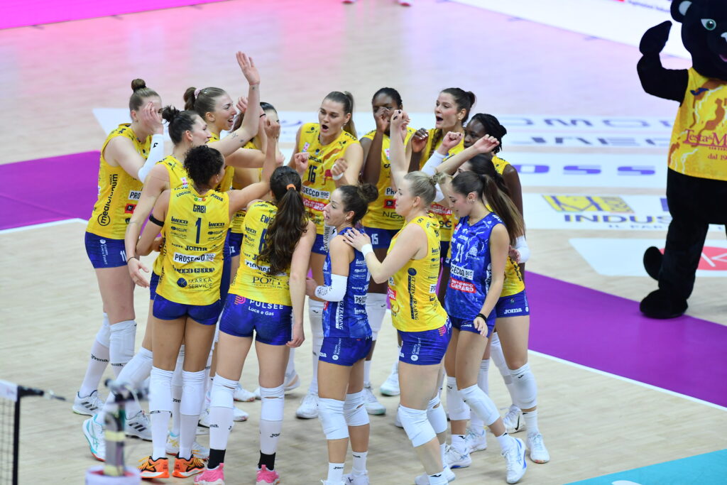Coach Daniele Santarelli schiera capitan Wolosz in regia e Isabelle Haak a completare la diagonale, Daalderop e Sillah sono le schiacciatrici, Fahr e Lubian le centrali, De Gennaro è il libero. Dall’altra parte, coach Andrea Pistola sceglie Bartolucci al palleggio e Bici opposta, Giovannini e Omoruyi sono le bande, Candi e Butigan le centrali, De Bortoli è il libero. Le Tigri marchigiane sono costruite e guidate dal direttore sportivo Alessio Simone, ex-assistente nella panchina gialloblù al Palaverde.